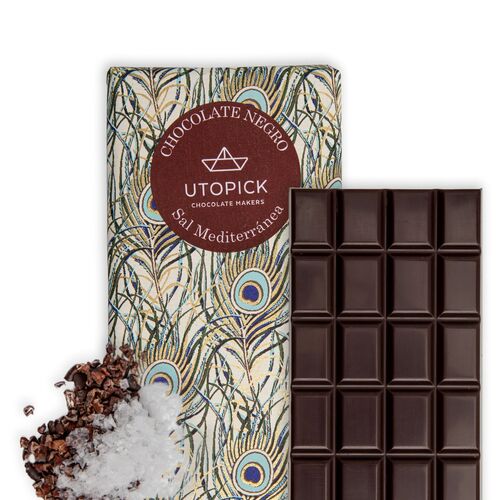 Dark chocolate (70% cocoa) accompanied by Mediterranean salt flakes and nibs (pieces of roasted cocoa) that complement it perfectly. What an invincible combo. For those who want contrasts without losing flavor and presence.